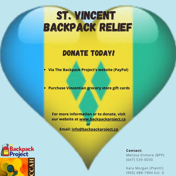 The Backpack Project, in partnership with the Canadian Caribbean Association of Halton (CCAH), will be assisting school-aged children and families affected by the volcano that erupted in St. Vincent and the Grenadines. Backpacks containing stationery and personal health items will be assembled and shipped to students in SVG for the upcoming school year. Backpacks containing non-perishable food items will be distributed to families, with food items purchased from local businesses and food establishments. We ask for your financial support, as we work to assist these students and families.